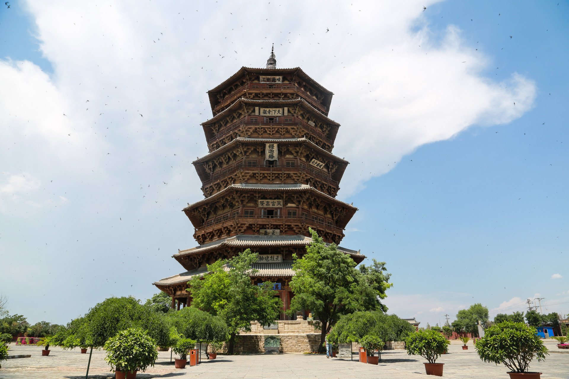 释迦塔塔高67.31米,底层直径30.27米,呈平面八角形。全塔耗材红松木料3000立方米,2600多吨,纯木结构、无钉无铆。塔内供奉着两颗释迦牟尼佛牙舍利。